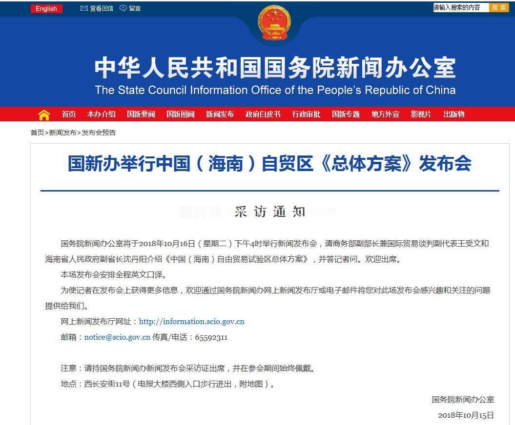 国务院新闻办公室将于2018年10月16日(星期二)下午4时举行新闻发布会,请商务部副部长兼国际贸易谈判副代表王受文和海南省人民政府副省长沈丹阳介绍《中国(海南)自由贸易试验区总体方案》,并答记者问。欢迎出席。